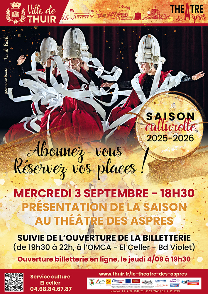 « Pour cette nouvelle saison, le Théâtre des Aspres vous invite dans un monde d’émotions, vous invite à vous émerveiller… autour d’une programmation riche de sens où se rencontrent tous les genres du spectacle vivant. Il y aura des spectacles qui font battre les cœurs pour les