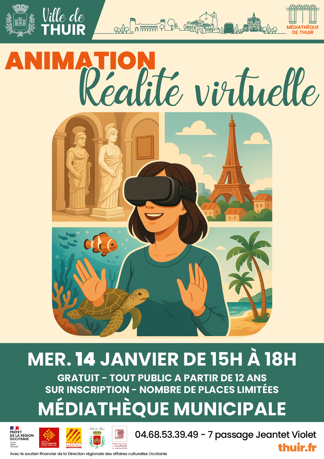 Animation / Réalité virtuelle + Ajouter à mon Agenda Google Date 14 janvier 2026 Heure 15:00 Lieu Médiathèque Passage Simone Jeantet-Violet Catégorie Culture Médiathèque Organisateur Médiathèque Téléphone 04 68 53 39 49 Email mediatheque.municipale@thuir.fr Partagez cet événement RechercherRechercherRecent PostsCollecte des sapins de Noël Médiathèque – Le programme de Janvier Vœux du Maire à la population Marchés exceptionnels de fin d’année NADAL DES OURS – Découvrez le programme des festivités… Recent CommentsAucun commentaire à afficher.