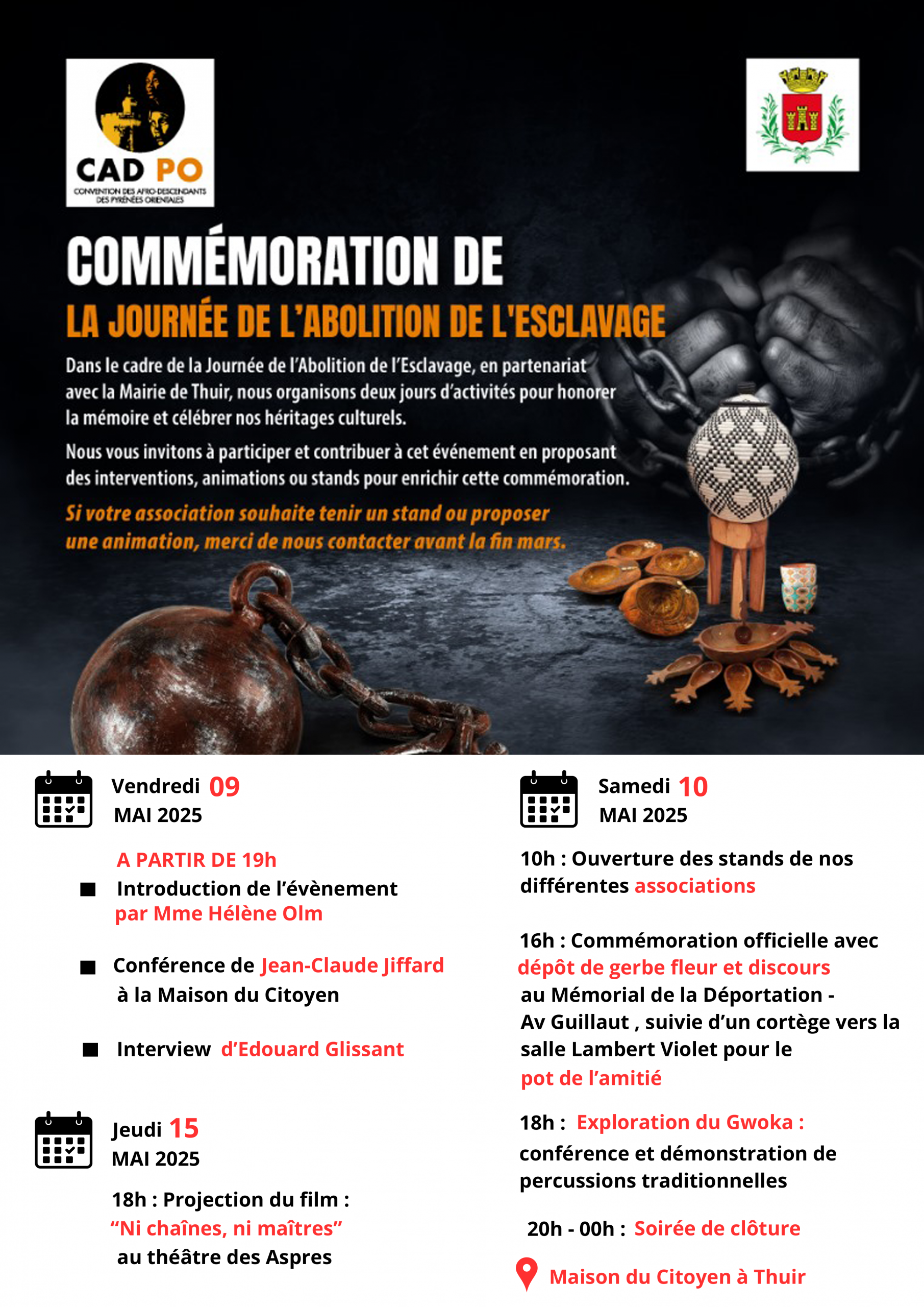 Commémoration de la journée de l’abolition de l’esclavage Date 15 mai 2025 Expiré! Heure 18:00 Lieu Théâtre des Aspres Bd Violet Catégorie Divers Partagez cet événement RechercherRechercherRecent PostsNADAL DES OURS – Découvrez le programme des festivités… Conseil municipal 3 décembre Commission de contrôle des listes électorales Médiathèque – Le programme pour Novembre et Décembre ALERTE METEO VENT VIOLENT Recent CommentsAucun commentaire à afficher.