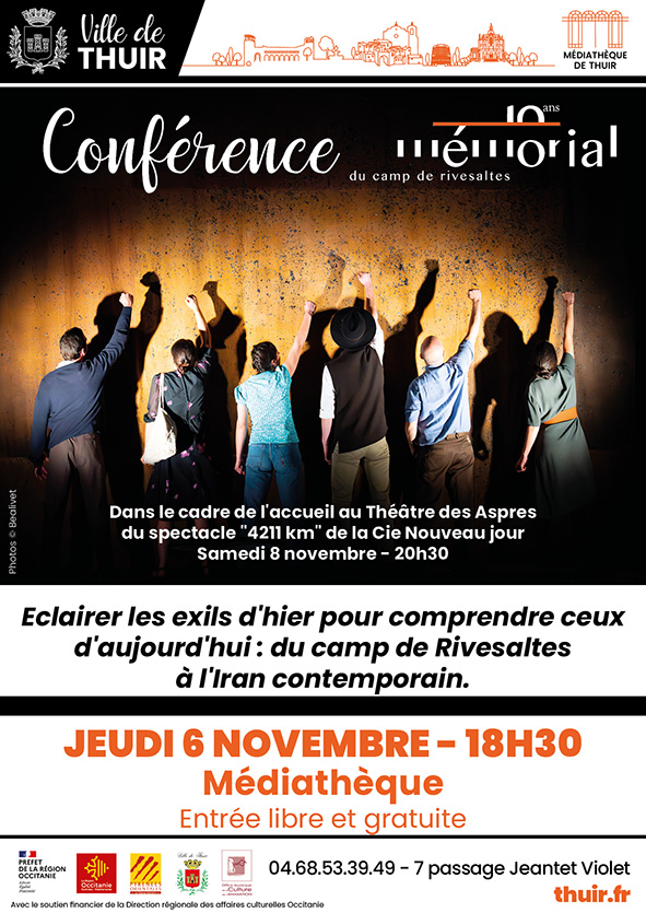 Cette conférence réalisée par l’équipe du Mémorial du camp de Rivesaltes permet de revenir sur l’histoire complexe et longtemps ignorée du camp de Rivesaltes, en écho au spectacle « 4211 km » d’Aïla Navidi, programmé au Théâtre des Aspres de Thuir.