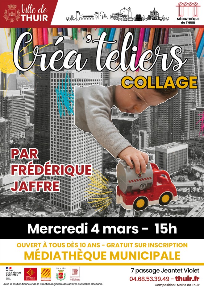 Créa’telier « Collage » + Ajouter à mon Agenda Google Date 4 mars 2026 Heure 15:00 Lieu Médiathèque Passage Simone Jeantet-Violet Catégorie Culture Médiathèque Organisateur Médiathèque Téléphone 04 68 53 39 49 Email mediatheque.municipale@thuir.fr Partagez cet événement RechercherRechercherRecent PostsMédiathèque – Le programme de Mars Listes électorales – Publication du tableau des inscriptions et radiations. Informations importantes suite à la tempête TEMPÊTE NILS (12/02/26) TEMPÊTE NILS – Les équipes municipales pleinement mobilisées (12/02/26) Recent CommentsAucun commentaire à afficher.