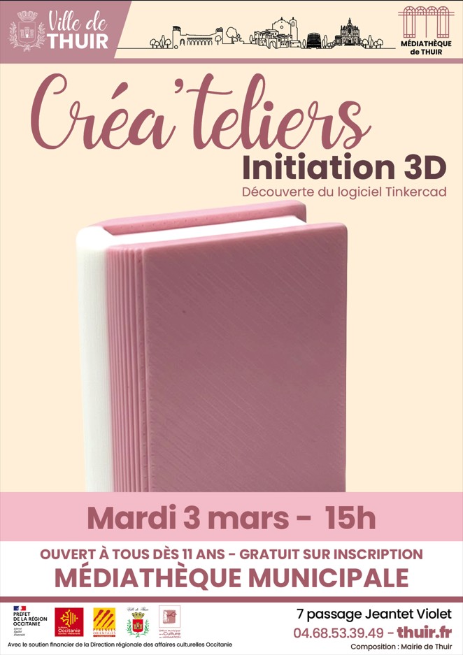 Créa’telier « Initiation 3D » + Ajouter à mon Agenda Google Date 3 mars 2026 Heure 15:00 Lieu Médiathèque Passage Simone Jeantet-Violet Catégorie Culture Médiathèque Organisateur Médiathèque Téléphone 04 68 53 39 49 Email mediatheque.municipale@thuir.fr Partagez cet événement RechercherRechercherRecent PostsMédiathèque – Le programme de Mars Listes électorales – Publication du tableau des inscriptions et radiations. Informations importantes suite à la tempête TEMPÊTE NILS (12/02/26) TEMPÊTE NILS – Les équipes municipales pleinement mobilisées (12/02/26) Recent CommentsAucun commentaire à afficher.