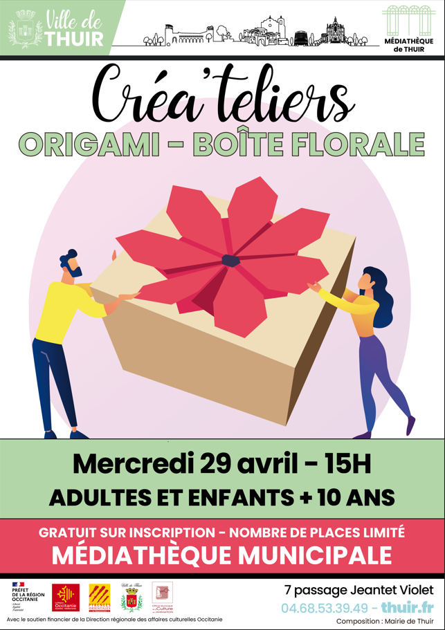 Créa’teliers Origami Boîte Florale + Ajouter à mon Agenda Google Date 29 avril 2026 Heure 15:00 Lieu Médiathèque Passage Simone Jeantet-Violet Organisateur Médiathèque Téléphone 04 68 53 39 49 Email mediatheque.municipale@thuir.fr Partagez cet événement RechercherRechercherRecent PostsConseil municipal 29 avril Conseil municipal 8 avril Médiathèque – Le programme d’Avril Avis de publicité aux associations – Installation du conseil d’administration du Centre Communal d’Action Sociale Conseil municipal 20 mars Recent CommentsAucun commentaire à afficher.