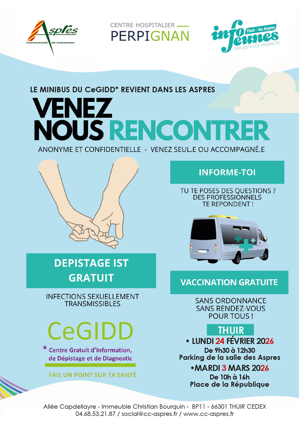 Dans le cadre du Contrat Local de Santé des Aspres, le CeGIDD (Centre de prévention et d’information sur la santé sexuelle et les dépistages) et le centre de vaccination seront à Thuir :