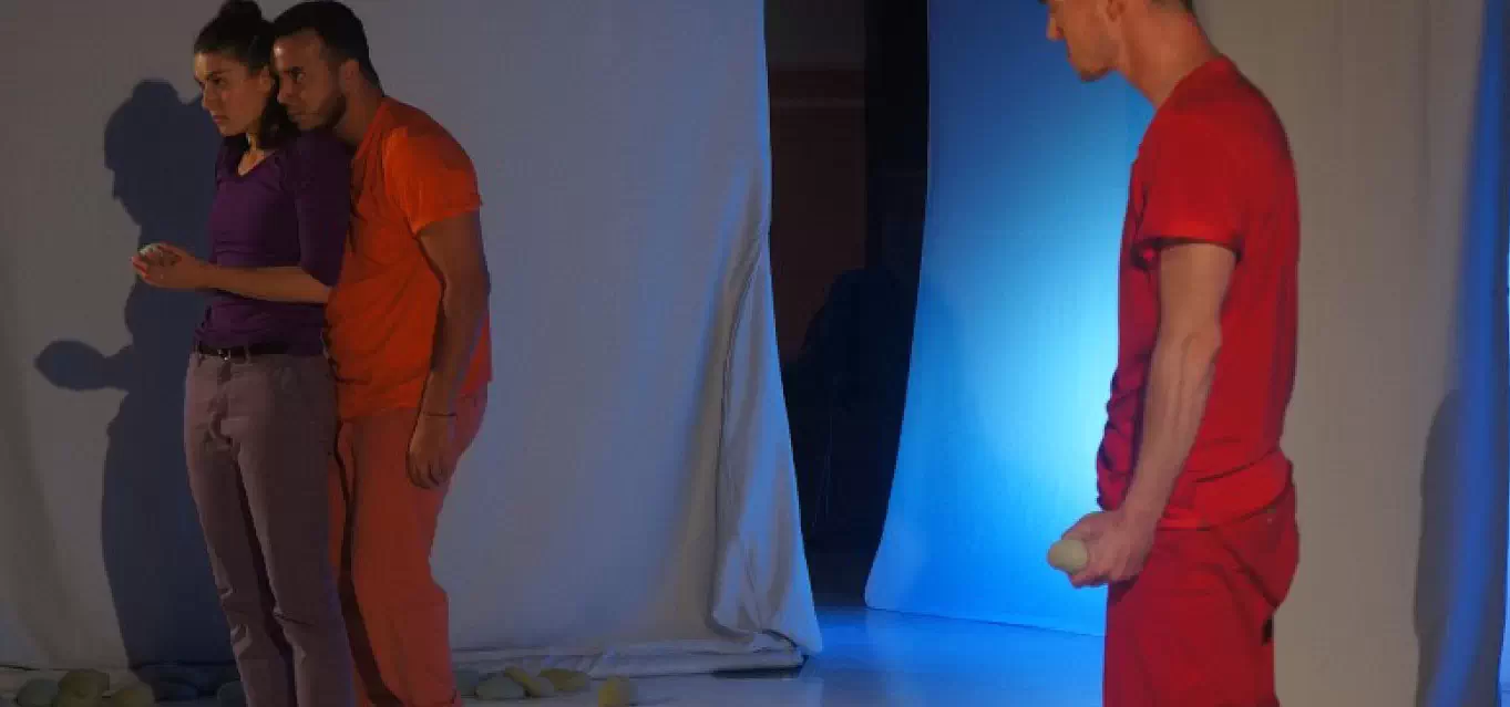 Projeté sur un décor de tissus, blanc immaculé, le caillou dessine le chemin ondulant de la construction des relations humaines, du vivre avec l’autre… Quelle issue et pour qui ?